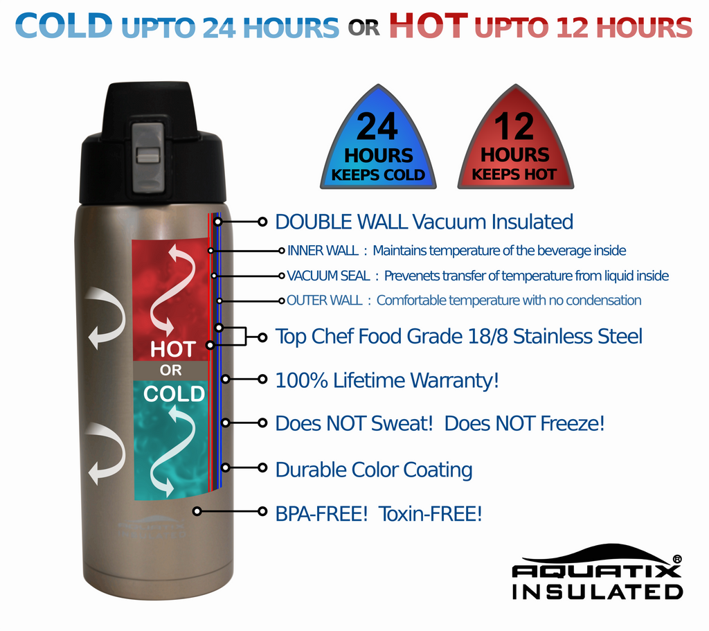 * Double vacuum insulated wall construction contributes to hot teas, soup, coffee or other blends being consistently hot for up to 12 hours. And, for cold water, smoothies, soft drinks, or anything you may need very cold, 24 hours of insulated confidence, guaranteed cold, period!