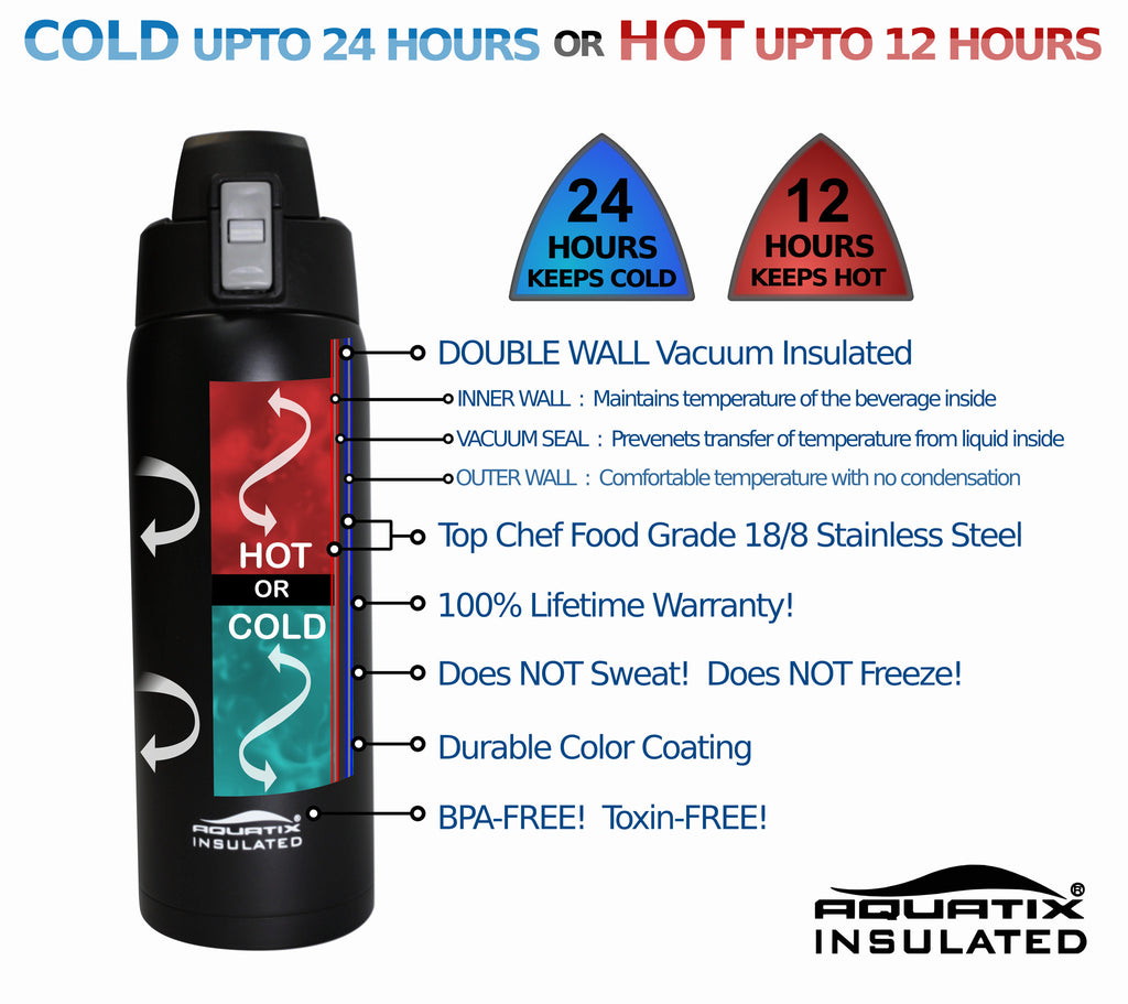 * Double vacuum insulated wall construction contributes to hot teas, soup, coffee or other blends being consistently hot for up to 12 hours. And, for cold water, smoothies, soft drinks, or anything you may need very cold, 24 hours of insulated confidence, guaranteed cold, period!
