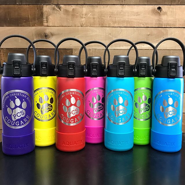 This listing is for an engraved 21 ounce Aquatix Insulated Bottle engraved on front with the "Pasadena Christian School Cougars" logo with a matching Protective Sleeve.